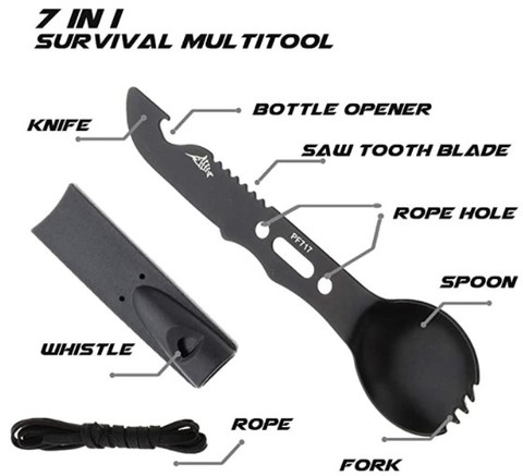 Combo de cuchara Spork multifuncional de acero inoxidable 7 en 1, cuchillo con abrebotellas, Kit de utensilios de supervivencia para acampar